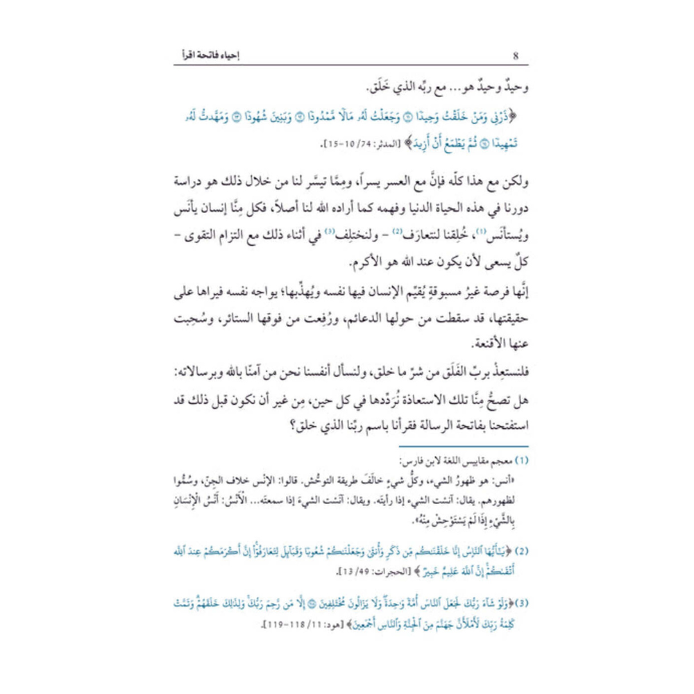 عنى هذا الكتاب بنفض الغبار عن فاتحة الوحي لاستعادة كامل البنود في منهاج ’اقرأ‘ المبارَك، الذي نهجه رسول الله صلى الله عليه وسلم، وذلك من خلال إطارَين أصيلَين هما: السياق القرآني، ولسانه المُعرِب العربي المبين، كما أنّه يُعنى بنا نحن - بني آدم - من كرَّمنا الله، نسعى إلى بلوغ إمكاناتنا الفكريّة والروحية مستعينين بـما فضَّلنا الله به على كثير ممن خَلَق تفضيلاً. فمنذ أكثر من أربعة عشر قرناً تحرّكت مجموعةٌ قليلةٌ باسم ربّها وبـ 'اقرأ!' فغيّرت مسار التاريخ. واليوم، حين يبدو وكأن التاريخ ينعطِف نحو الأسوأ، لا يزال بإمكان قلّة متفانية - مهما تفاوتت خلفياتها - أن تُحْدِث المعجزات. بل إن تفاوتها سِنّاً وثقافةً وعِرقاً يمكن أن يزيد من شموليتها وفعّاليتها.